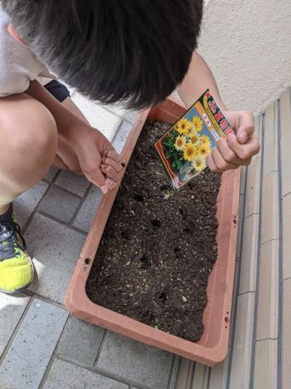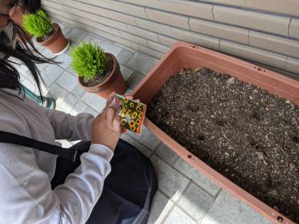 6年生が代表して玄関にミニひまわりの種を植えました。