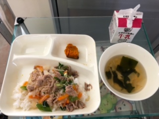今日の献立は、豚丼、湯葉のすまし汁、かぼちゃのしょうゆ焼き、ごはん、牛乳です。