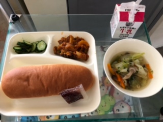 今日の献立は、じゃがいものミートグラタン、スープ、きゅうりのバジル風味サラダ、コッペパン、いちごジャム、牛乳です。