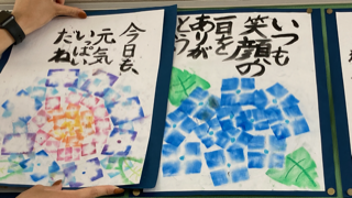 完成したアジサイの上に「友達にかけてあげたい言葉」や「自分が友達から言われたらうれしい言葉」を筆で書きました。