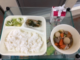 今日の献立は、ちくわのいそべあげ、あつあげとさといもの煮もの、あっさりキャベツ、ごはん、牛乳です。