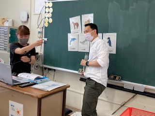 今日は、自宅にいる子も学校に来ている子も全員がTeamsを使用して、オンラインで英語の学習をしました。