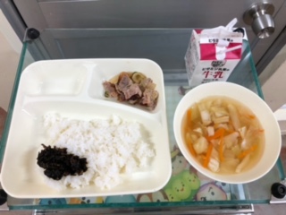 今日の献立は、豚肉のごまみそ焼き、すまし汁、のりのつくだ煮、ごはん、牛乳です。