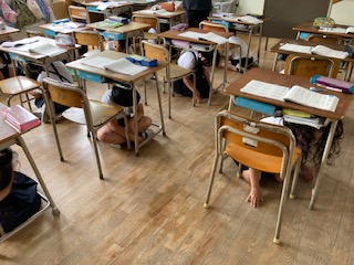 その後「地震発生」の放送を聞き、すばやく机の下にもぐって頭を守りました。