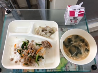 今日の献立は、豚ひき肉とにらのそぼろ丼、みそ汁、キャベツの赤じそあえ、ごはん、牛乳です。