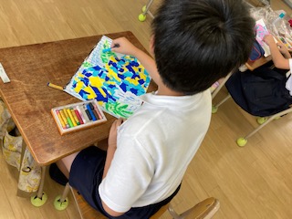 水色や紫、青などの色を画用紙に貼りつけて、花を作ったあと、葉っぱやカタツムリ、てるてる坊主などをクレパスで書き足していきます。