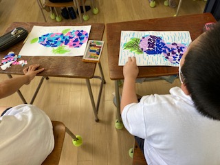 6月はアジサイです。折り紙を使ってアジサイの花を貼り絵にしていました。