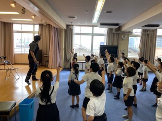 その後、「ジャンケン大会」「もうじゅうがり」などのゲームをして、大盛り上がり。「もうじゅうがり」では、1,2年生が同じグループになるよう、声かけをして交流していました。
