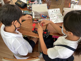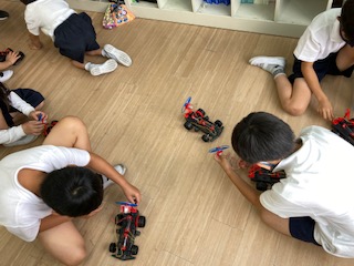 早くできた子が、まだの子に優しく教えたり、モーターカーを横に並べて一斉に競争したりと、協力して楽しく学習できていました。