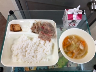 今日の献立は、ゴーヤチャンプルー、すまし汁、あつあげのしょうがじょうゆかけ、ごはん、牛乳です。