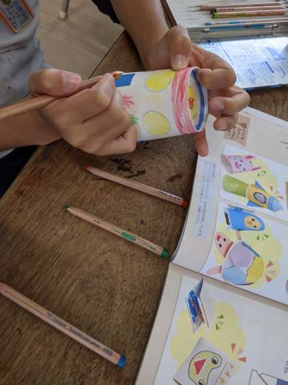 ゴムの力を利用して、紙コップを高く飛ばして、空中で上手にキャッチ。思い思いに紙コップに絵を描きました。