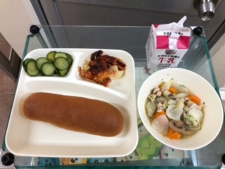 今日の献立は、鶏肉とてぼ豆のスープ煮、じゃがいもとトマトのチーズ焼き、きゅうりのサラダ、こくとうパン、牛乳です。