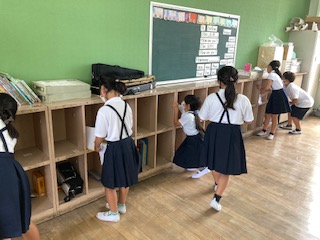3年生の教室では、2学期の係を決めていました。また、夏休み中しばらく使っていなかったロッカーを、新しいぞうきんでふいてきれいにしていました。