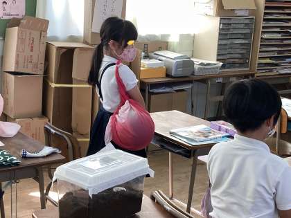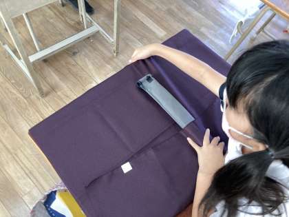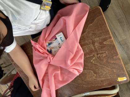 今日は先生が用意した色とりどりのきれいな風呂敷が一人ずつに配られ、自分でいろいろなものを包む学習をしていました。