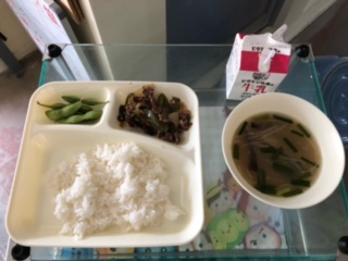 プルコギ、トック、えだまめ、ごはん、牛乳です。