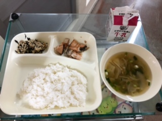 今日の献立は、さけのしょうゆ風味焼き、五目汁、高野どうふのいり煮、ごはん、牛乳です。