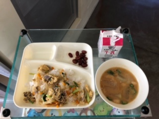 今日の献立は、他人丼、とうがんのみそ汁、金時豆の煮もの、ごはん、牛乳です。