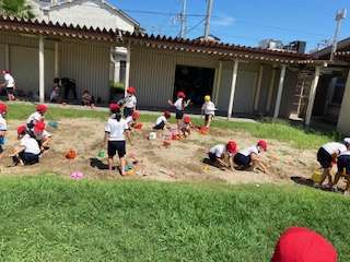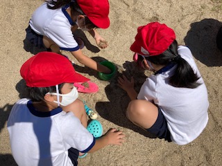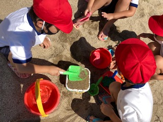 今日は楽しみにしていた砂遊びの日です。家から「スコップ」「バケツ」などの砂遊びセットを持ち寄りました。