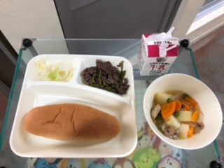 今日の献立は、牛肉の香味焼き、スープ煮、サワーキャベツ、こくとうパン、牛乳です。