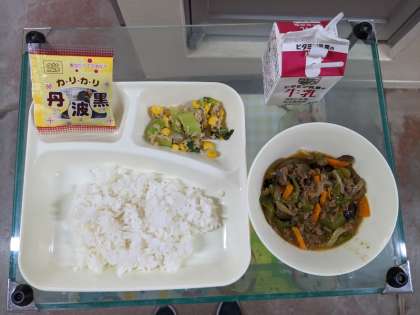 今日の献立は、マーボーなす、ツナとチンゲンサイのいためもの、いり黒豆、ごはん、牛乳です。