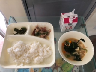 今日の献立は、豚肉の甘辛焼き、みそ汁、オクラのおかかいため、ごはん、牛乳です。