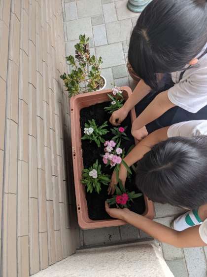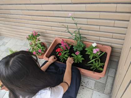 きれいな色のナデシコを、色合いを考えながら植えていました。