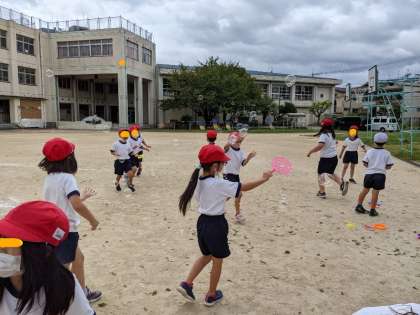 1年生が生活科の学習で、シャボン玉をつくって遊びました。
