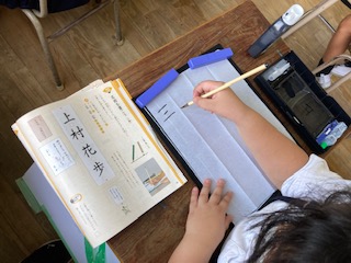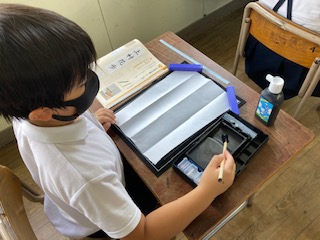 「筆は立てて書くこと」「十円玉くらいの間隔を空けてから最初の文字を書くこと」など、小筆で書く時のきまりをよく聞いて、いよいよスタートです。