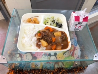 今日の献立は、ハヤシライス、キャベツのひじきドレッシング、さくらんぼ(缶)、牛乳です。