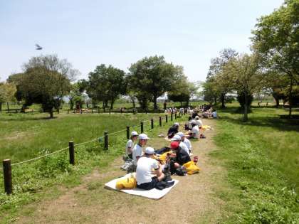 弁当は、広々とした草地で食べ、その後、広いスペースを使ってのびのびと遊びました。長なわとび、ハンドベースボール、鬼ごっこ、組体操など、時間いっぱい楽しむことができました。
