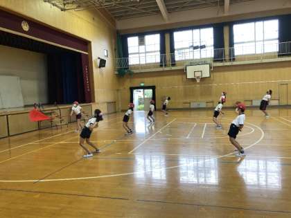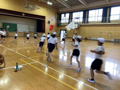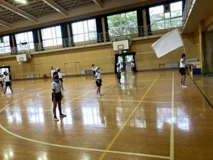 先生から「動かず立つ」「背筋をのばして座る」「応援のポーズをピシッときめる」などのアドバイスを受けて、最後にもう一度、入場から退場まで通して練習することになりました。