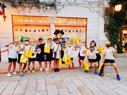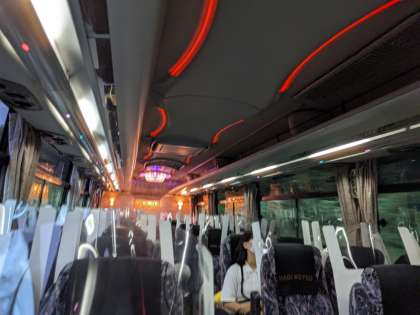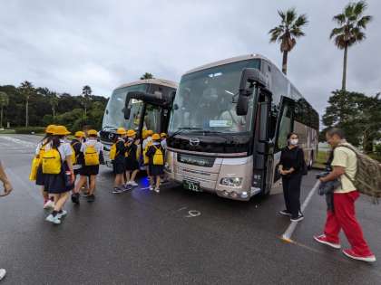 スペイン村を出発し、宿舎へ向かいます。手指消毒をしてからバスに乗りました。