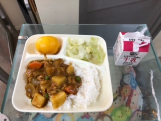 今日の献立は、ポークカレーライス、キャベツのピクルス、牛乳、みかんです。