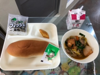 今日の献立は、豚肉といかの中華煮、大学いも、コッペパン、ソフトマーガリン、ミニフィッシュ、牛乳です。
