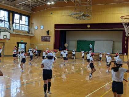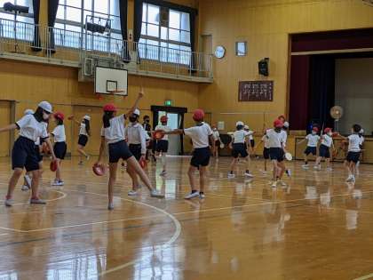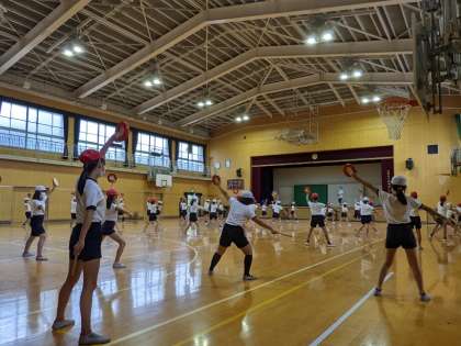 今日はエイサーで使うパーランクを手にし、曲に合わせて4人1グループで隊形移動の練習をしました。