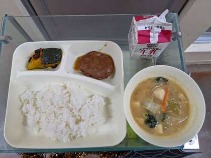 今日の献立は、和風ハンバーグ、とうふのみそ汁、かぼちゃのいとこに、ごはん、牛乳です。