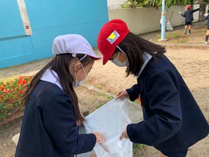 「いつも自分たちが遊んでいる南泉尾公園をきれいにしよう」「南泉尾公園にはどんな種類のごみが落ちているかな」「ごみの量はどのくらいかな」などのめあてをもち、清掃道具を持って出発しました。