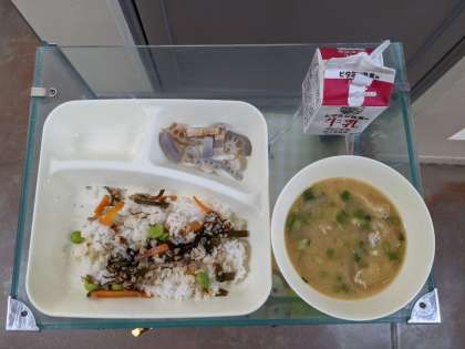 今日の献立は、もずくと豚ひき肉のジューシー、さつまいものみそ汁、焼きれんこん、牛乳です。