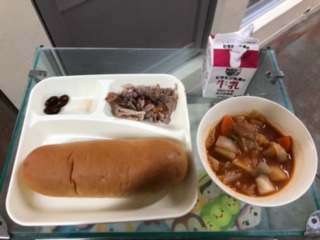 今日の献立は、豚肉のガーリック焼き、ケチャップ煮、うずら豆のグラッセ、こくとうパン、牛乳です。