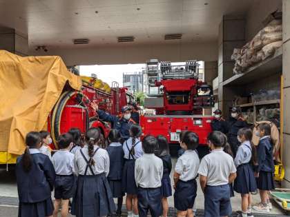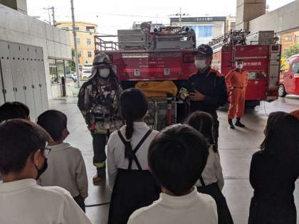 本物の消防車を目の前で見せていただいて、みんなその迫力ある姿に見入っていました。やはり本物を見ることは一番の学習になると感じました。今日の見学で、消防士や消防車を身近に感じてくれることでしょう。