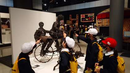 運動会で踊ったサージをまいた人形の展示を見たり、戦争で使った銃を材料にした自転車を見たりして、子ども達は世界各地の文化や歴史について興味深く学びました。