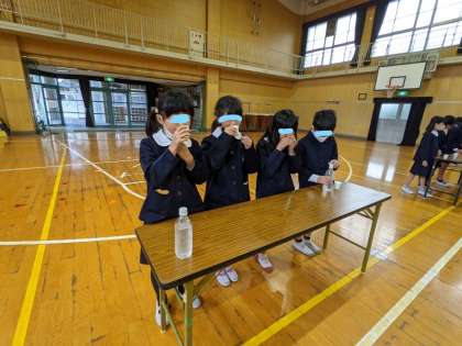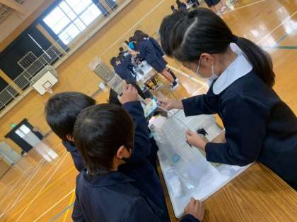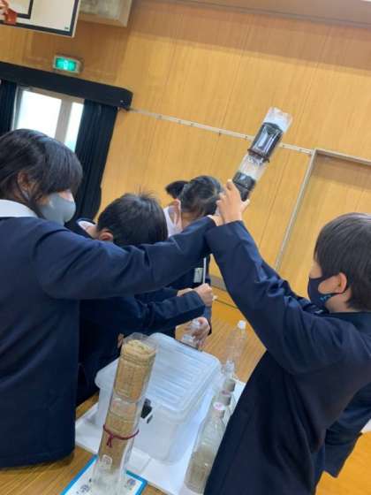 汚れた水をろ過する実験では、あまりにもきれいになった水に感動し、「あんなに汚かったのにこんなにきれいになった!」「なんでこんなにきれいにできるんやろう」と口々に感想を言っていました。