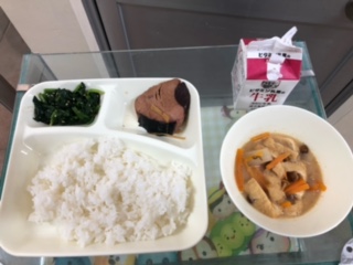 今日の献立は、なまりぶしのしょうが煮、なめこのみそ汁、ほうれんそうのごまあえ、ごはん、牛乳です。