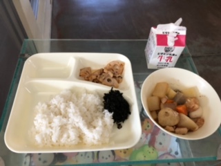 今日の献立は、関東煮、れんこんの梅風味焼き、のりのつくだ煮、ごはん、牛乳です。