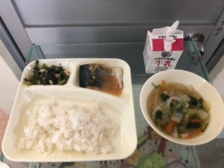 今日の献立は、さばのみぞれかけ、すまし汁、こまつなの煮びたし、ごはん、牛乳です。