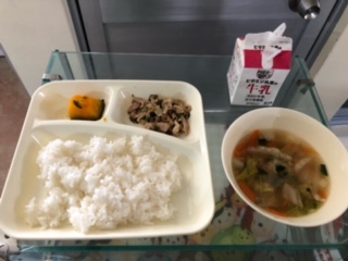 今日の献立は、豚肉と干しずいきのみそ煮、うすくず汁、焼きかぼちゃの甘みつかけ、ごはん、牛乳です。