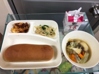 今日の献立は、ポトフ、カレーソテー、桃のクラフティ、こくとうパン、牛乳です。