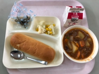 今日の献立は、ビーフシチュー、カリフラワーのピクルス、ミニフィッシュ、おさつパン、牛乳です。