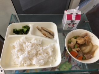 今日の献立は、きびなごてんぷら、一口がんもとじゃがいもの煮もの、ブロッコリーのしょうがづけ、ごはん、牛乳です。