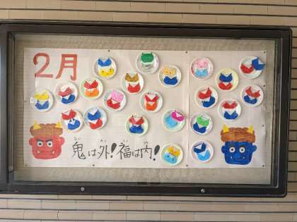 今、学校の玄関では、2年生がつくったかわいい鬼たちが子どもたちや来校者を出迎えています。一人ひとり違うように、いろいろな表情の鬼がいます。心の鬼を追い払って、思いやりのある心をもち、素敵な一年にしていきたいものです。